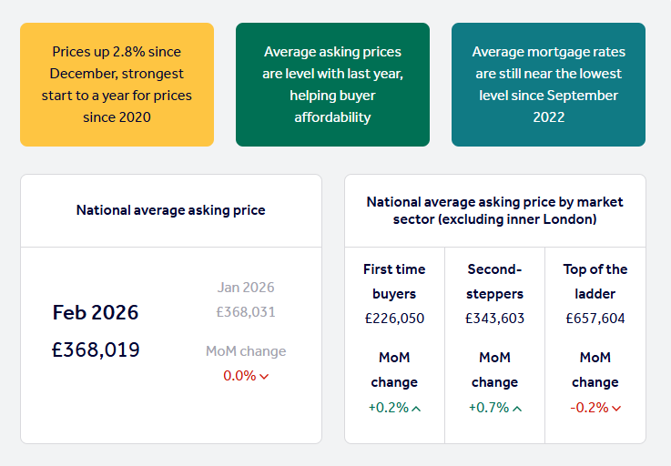 The latest Rightmove House Price Index shows the national average asking price at £368,019, effectively unchanged month-on-month (0.0%). Following the strongest start to a year for prices since 2020, February’s pause suggests the market is consolidating rather than accelerating.