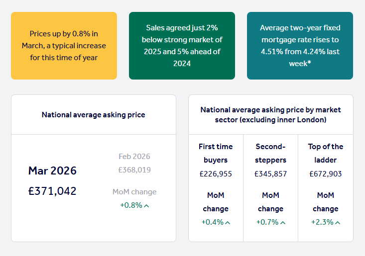 The latest Rightmove House Price Index shows a 0.8% increase in average asking prices, taking the national figure to £371,042. This follows February’s flat performance and reflects a typical spring uplift as more sellers come to market.